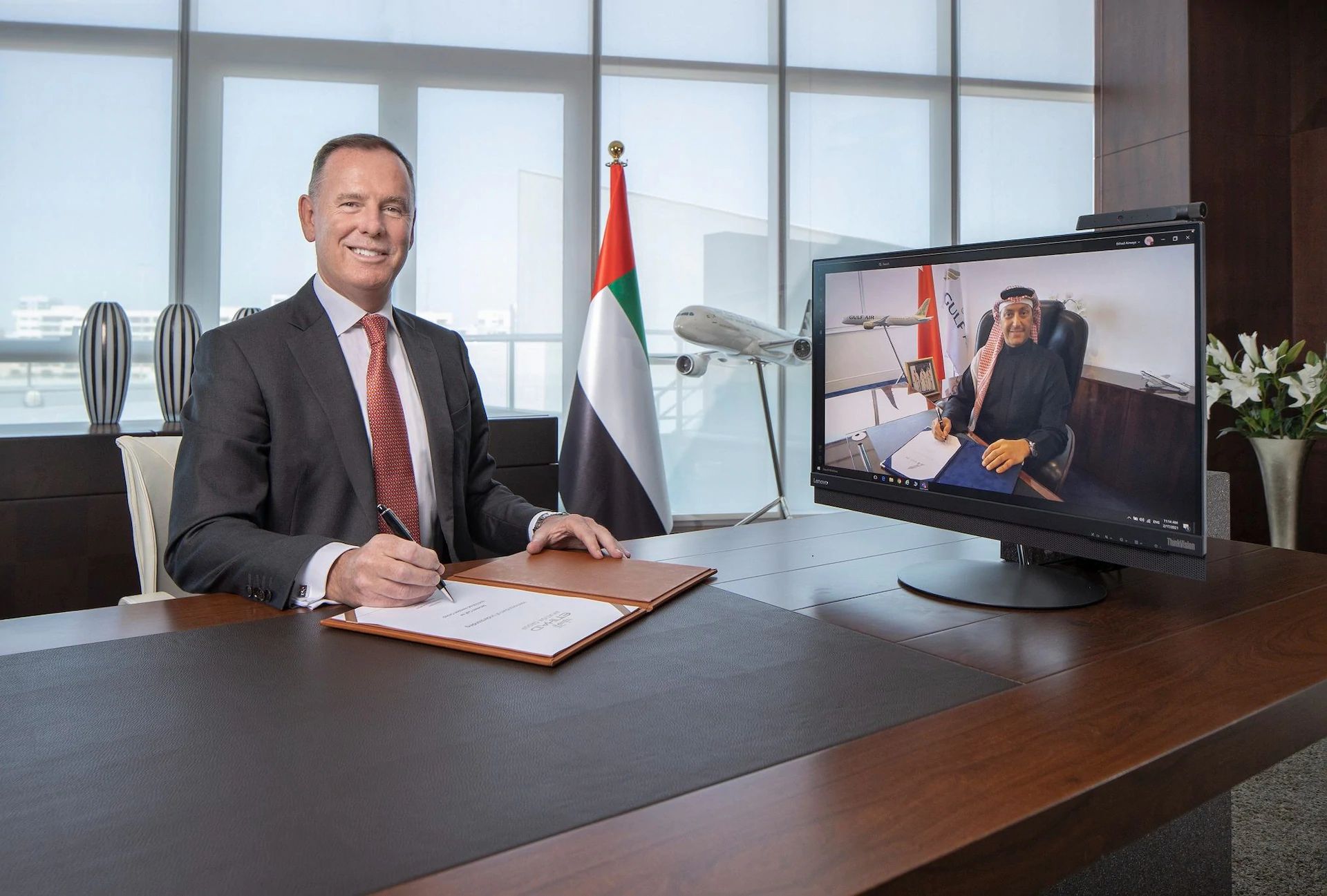 Stratejik Ticari İşbirliği Anlaşması, Etihad Havacılık Grubu Grup İcra Kurulu Başkanı Tony Douglas ve Gulf Air’in İcra Kurulu Başkan Vekili Yüzbaşı Waleed AlAlawi tarafından imzalandı.