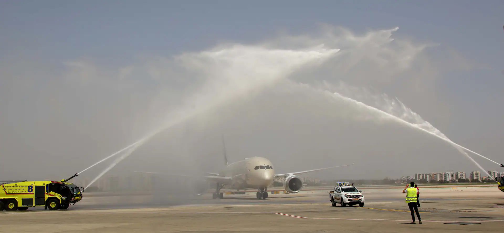 Uçak, İsrail saatiyle 12: 30’da Ben Gurion Havalimanı’na indi ve geleneksel tazyikli su ile karşılandı. Ardından BAE’nin İsrail Büyükelçisi Etihad’ın Grup CEO’su ve Ben Gurion Uluslararası Havaalanı CEO’su Shmuel Zakay tarafından yapılan konuşmalarla bir karşılama resepsiyonu düzenlendi.